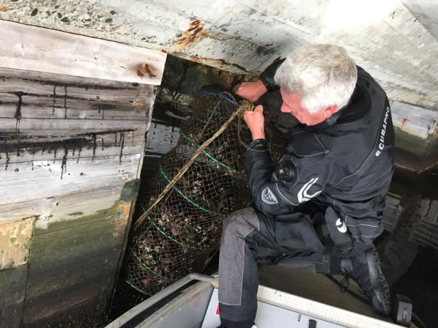 NIVA-scientists have compared caged and native blue mussels (Mytilus edulis spp.) for environmental monitoring of PAH, PCB and trace metals (Photo: Lise Tveiten, NIVA).