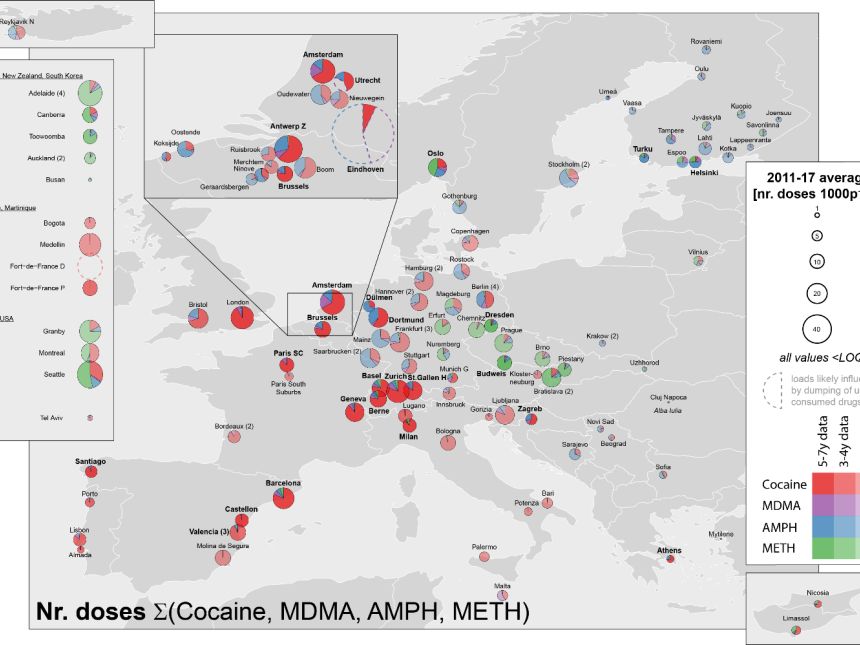 In total, wastewater from over 60 million people in 120 cities from 37 countries was analyzed at least once over a one-week period to explore spatial population-level trends in the use of four illicit substances (amphetamine, methamphetamine, ecstasy, cocaine). Twenty-six cities from 14 European countries (covering approx. 19.3 million people) were monitored for at least five years, building a core data set that allowed to assess temporal trends in drug-taking behaviours.
