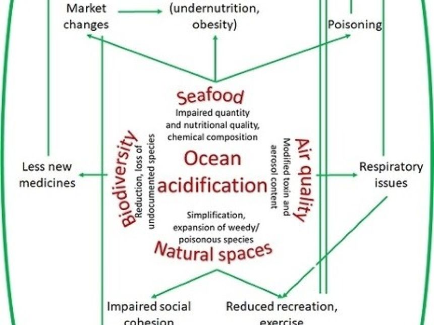 In a recent article in The International Journal of Environmental Research and Public Health, entitled Ocean Acidification and Human Health, scientists look at how ocean acidification effects human health and well-being. This perspective involves understanding substantial complexity, making this particular driver one of the more challenging to comprehend and manage. Compared to studies of other stressors, which tend to focus on direct effects (extreme events such as floods or storms, enrichment of chemical additives, or persistent elevated temperature), ocean acidification manifests in layers of complexity involving indirect effects and interactions. While studies of ocean acidification initially focused on the potential direct effects, research now incorporates the ecosystem-level complexity of indirect effects.
