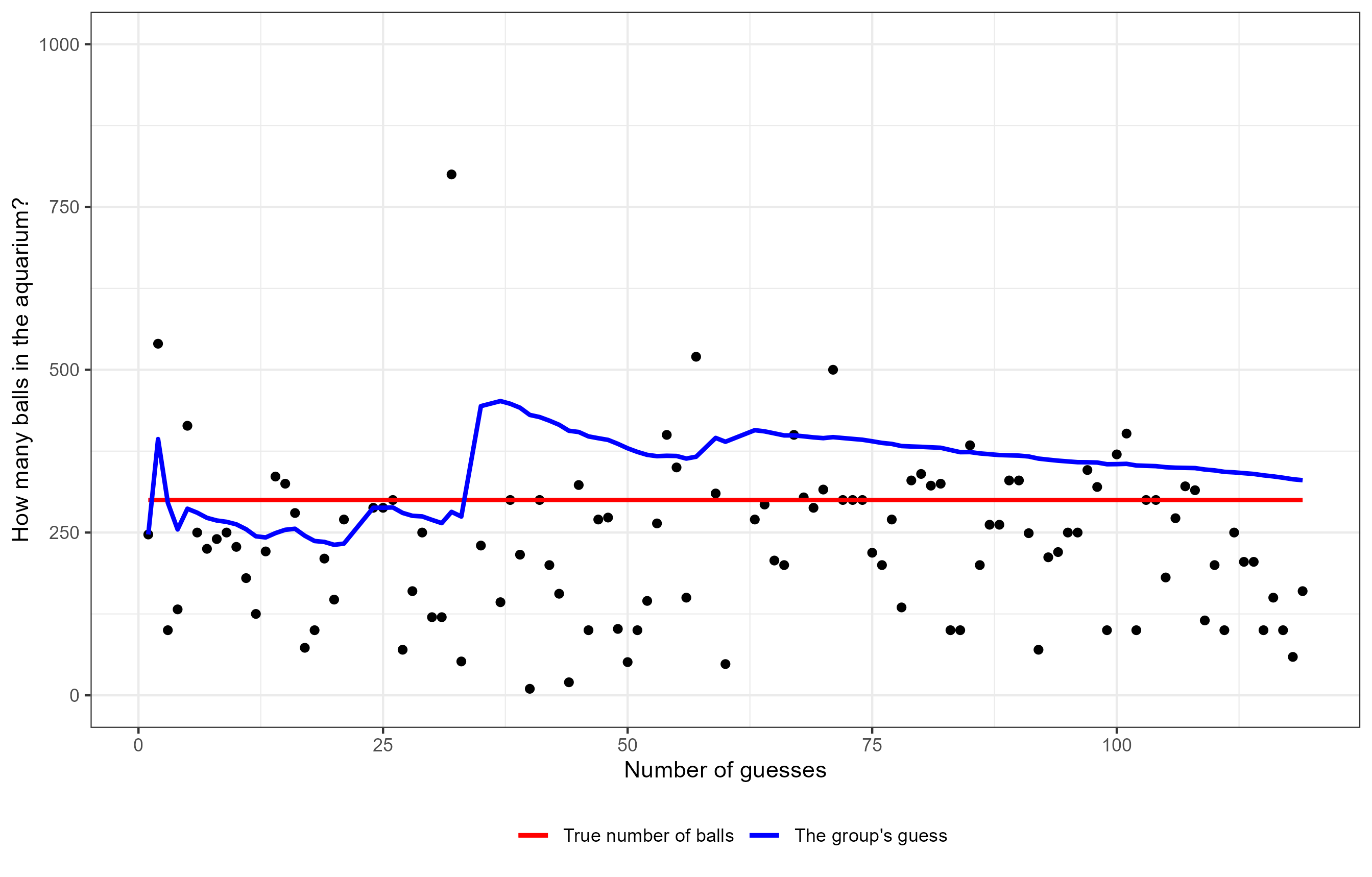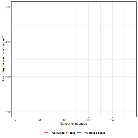 In the graph to the left, we show all the individual guesses (black dots), the number of balls in the aquarium (the red line) and the group's guess, which is the average of all the guesses up to that point (blue line). We see that the blue line gets closer and closer to the red line as more and more people add their guesses. In the animation to the right, we show how this plays out in real-time. That is, how the group's guess changes as more people add their guess to it.