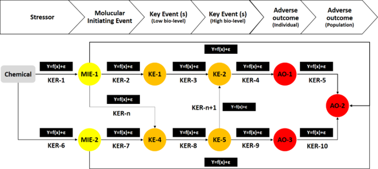 Figure 2. A Quantitative Adverse Outcome Pathway (qAOP) network for predicting the adverse effect of a chemical based on molecular/cellular responses in an organism.