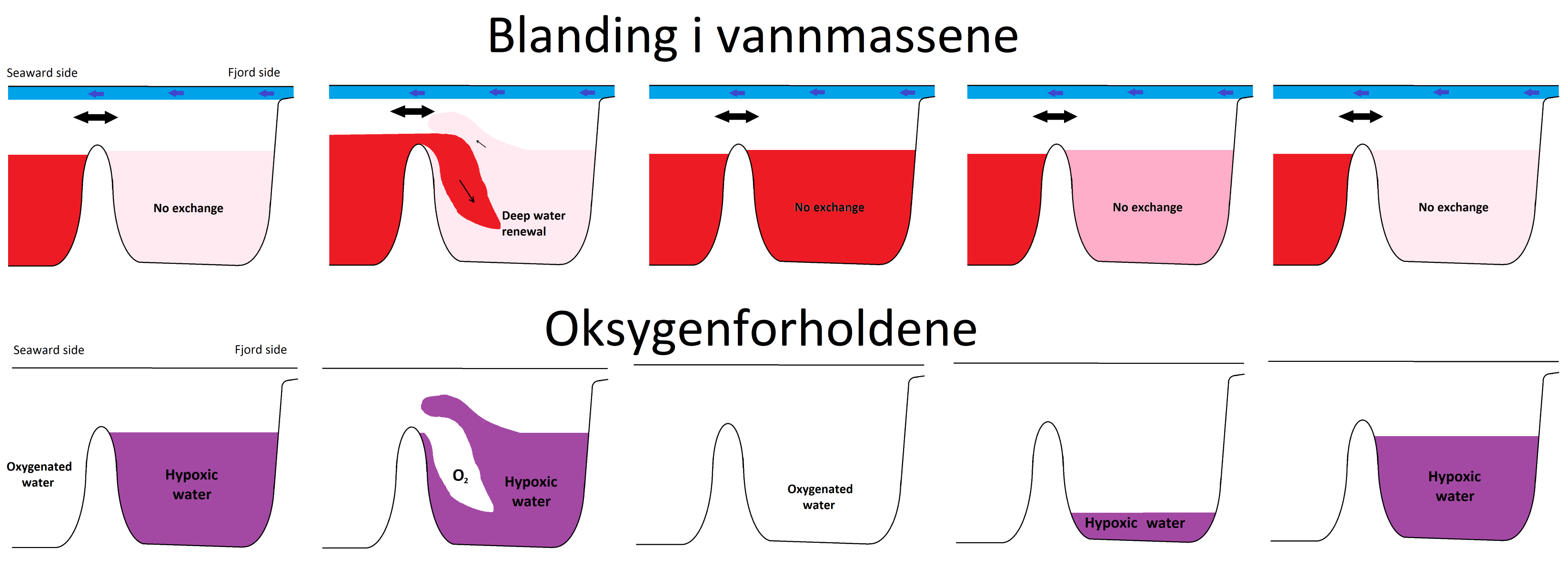 I illustrasjonen under (trykk på bildet for å laste ned høyoppløselig versjon) vises det fem stadier i utviklingen fra situasjonen rett før en dypvannsfornyelse, under dypvannsfornyelsen og etter dypvannfornyelsen. Øverste rad viser vannmassenes egenvekt, der rødt er det tyngste vannet og rosa er lettere vann. Nederste rad viser oksygenforholdene, der lilla er oksygenfattig vann og hvitt er oksygenrikt vann.
