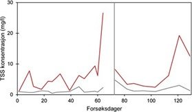 Partikkelbelastningen i RAS-enhetene med høy TSS var gjennomsnittlig 6,77 mg/l TSS i ferskvannssystemene og 7,31 mg/l TSS i brakkvannssystemene. Tilsvarende tall for systemene med lav TSS var henholdsvis 1,13 og 2,06 mg/l TSS. Konsentrasjonen av TSS varierte relativt mye mellom høy TSS- systemene og i løpet av perioden, men steg mot slutten av hver fase da systemene ble utfordret litt ekstra (Figur 10). Vannet i systemene med høy partikkelbelastning hadde høyere andel av større partikler og naturlig nok noe høyere turbiditet og totalt organisk karbon (TOC), enn systemene med lav partikkelbelastning. Den høye partikkelbelastningen førte også til noe redusert biofilterfunksjon (Figur 11 a, b og c), med litt høyere konsentrasjon av totalt ammonium nitrogen (TAN) og nitritt (NO2), samt lavere nitrat (NO3). Mot slutten av både ferskvannsfasen og brakkvannsfasen minket konsentrasjonen av nitrat, sannsynligvis på grunn av økt spedevannsforbruk.