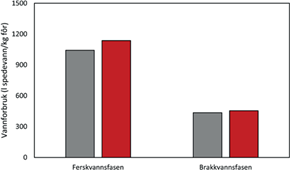 Siden hovedmålet med prosjektet og forsøkene er å fremskaffe økt kunnskap om sammenhengene mellom laksens mikrobiomer, produksjonsmiljø, vann- kvalitet og fiskehelse/-velferd, ble det etterstrebet tilsvarende betingelser som i industrien. I RAS-fasen ble det valgt en partikkelbelastning (Figur 8) som tilsvarer forhold som finnes i industrien (høy TSS, 7-8 mg/l) og forhold som kanskje flere ønsker å oppnå (lav TSS, 1-2 mg/l). RAS- enhetene ble driftet med 55,9±1,8 l/min (helesystemvolumetsirkulerer 1,34 ganger per time), tilsvarende spedevannsforbruk og fôring (Figur 9), 12,3±0.8 °C, oksygen- metning 93,0±5,6 %, pH 7,2-8,2 (FV) og 7,0-8,1 (BV) og en saltholdighet på 1,4±0,1 (FV) og 14,5±1,0 (BV).
