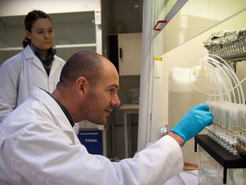 Foran seg har NIVA-forsker Malcolm Reid et sett vannprøver, som er nøklene til å forstå europeisk dopbruk.