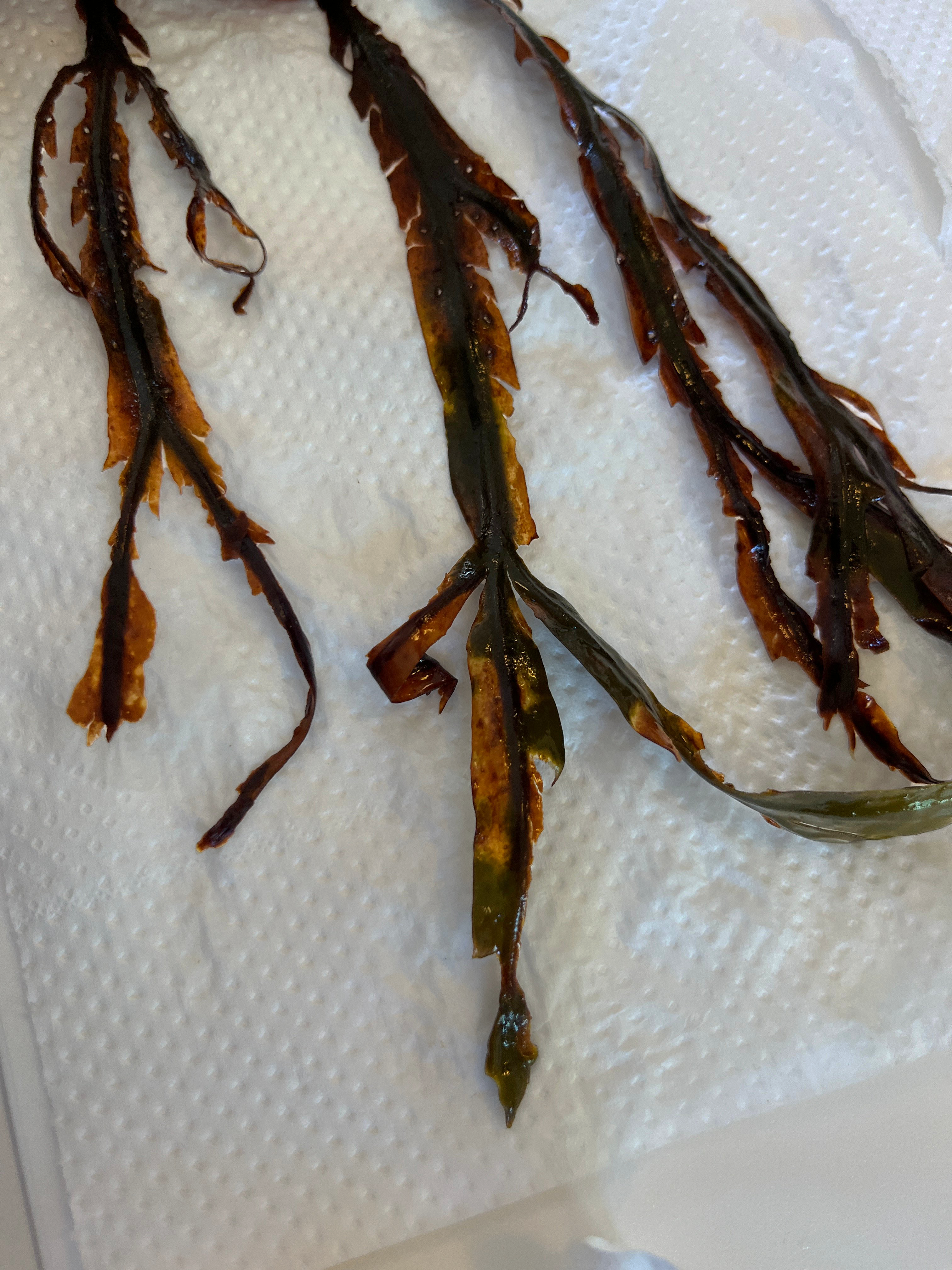 – Se her, da. Nekrose på tangen. Vi kan se at bladene er misfarget med røde, gulaktige og svarte flekker, et tydelig tegn på syk tang.