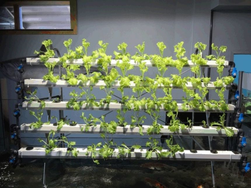 I et Aquaponics-anlegg kombineres fiskeoppdrett og planteproduksjon. Et slikt demonstrasjonsanlegg er nå å finne på Akvariet i Bergen.