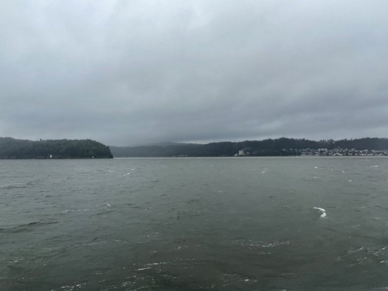 Fjorden var preget av avrenning fra elvene. På bildet ser vi brunt vann fra Sandeelva, som lå utenfor Holmestrand.