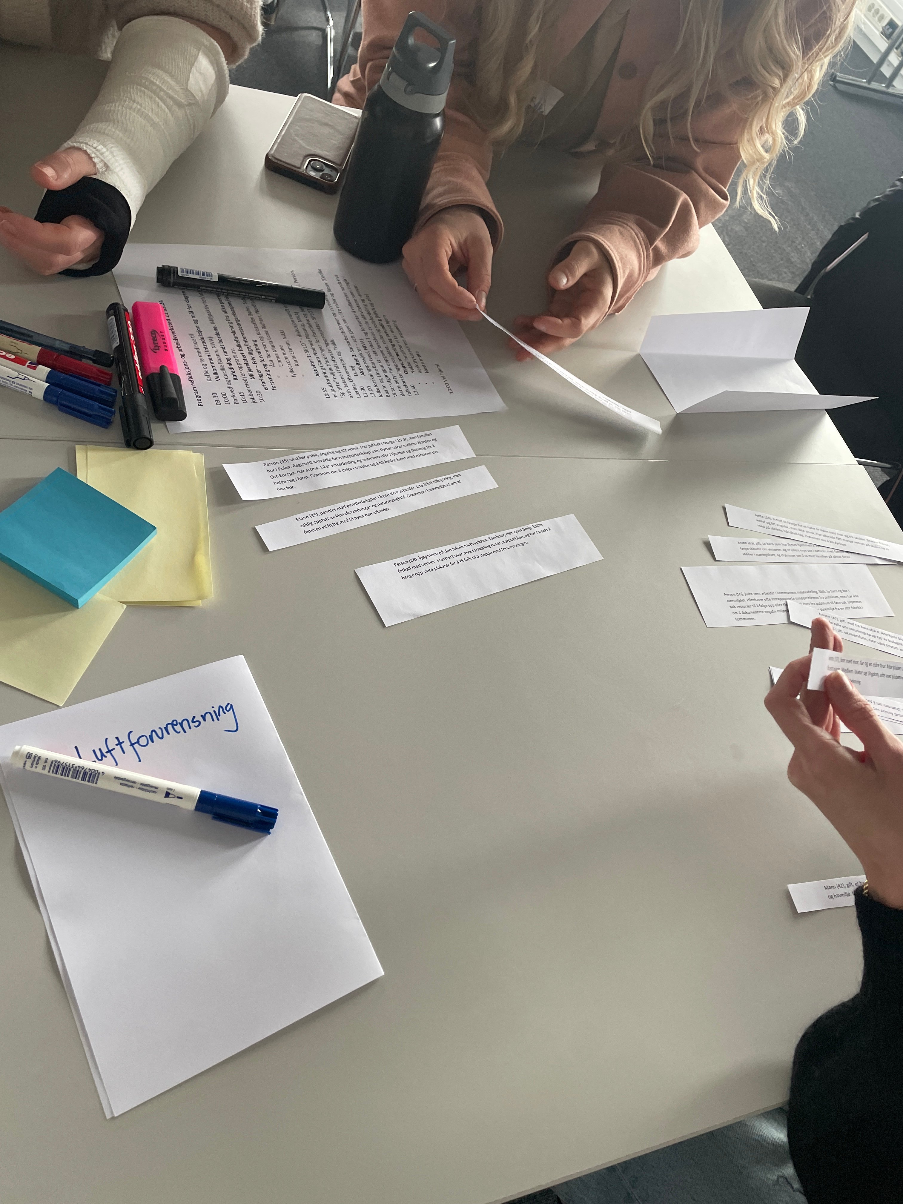 I andre gruppeøvelse, så vi på hvordan man kan inkludere ulike aktører i flere deler av et folkeforskningsforløp. Vi så på samarbeidsformer og avveininger i folkeforskningsprosjekter gjennom ulike roller og linser hvor vi brukte en øvelse satt opp rundt ulike «personas». Gruppene diskuterte hvordan nå ulike innbyggertyper, for å få dem med i et folkeforskningsprosjekt. Vi tenkte over hva de kan få ut av å være med, og hvordan tilrettelegge for det. Hver gruppe valgte en miljøutfordring, f.eks. luftforurensning, og flere personer/ «personas» fra materialet. En gruppe gjorde for eksempel et tilfeldig utvalg basert på at det bor mange forskjellige mennesker langs Akerselva, som de hadde valgt som område for sin øvelse, og diskuterte rundt det.