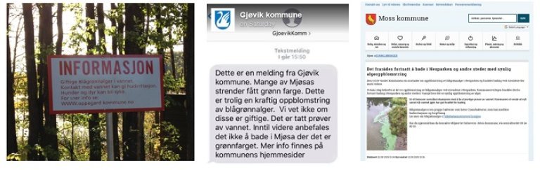 Det er mange måter å informere publikum om cyanobakterier. Ta i bruk informasjonstavler ved innsjøen/badeplassen og informer også på kommunen sine hjemmesider eller send en sms til alle innbyggere.